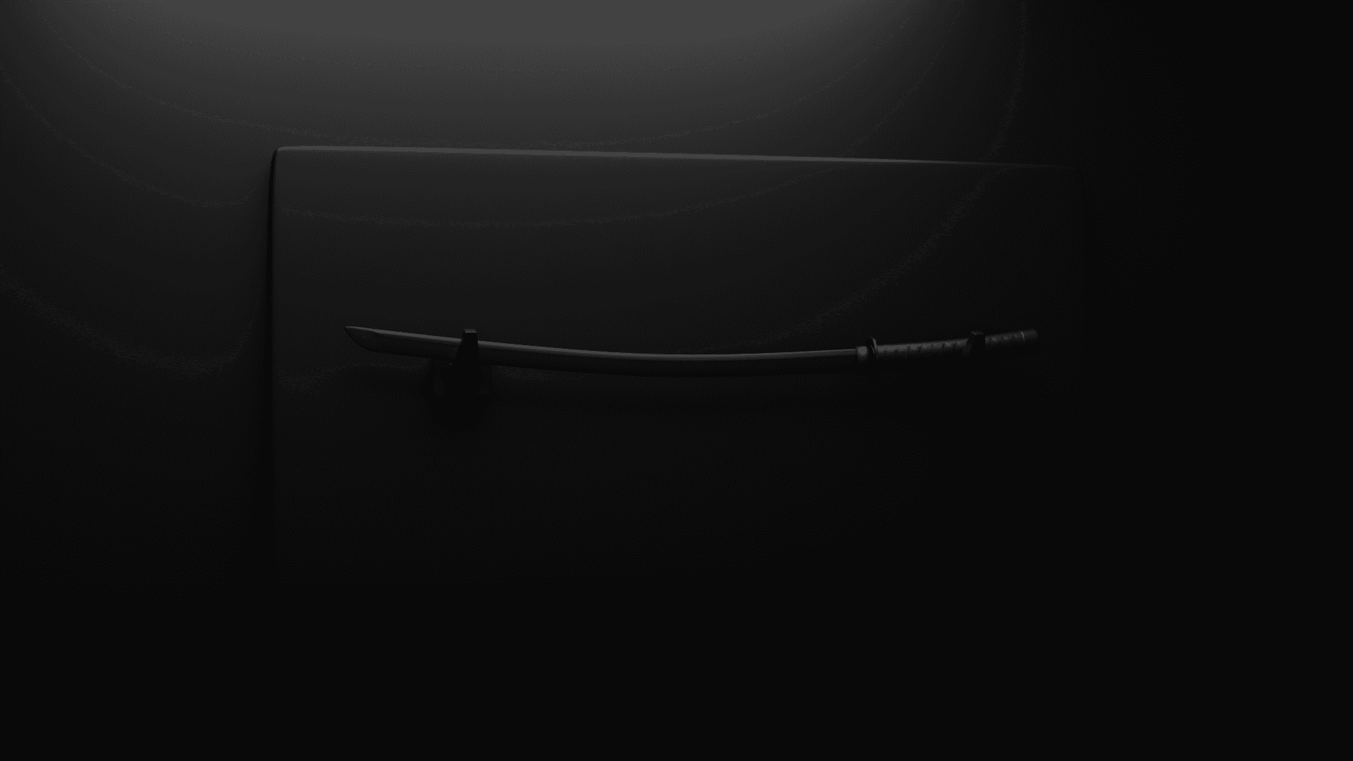 Katana mounted on wall. No textures, just a simple model. Rendered in different grayscales for some reason...